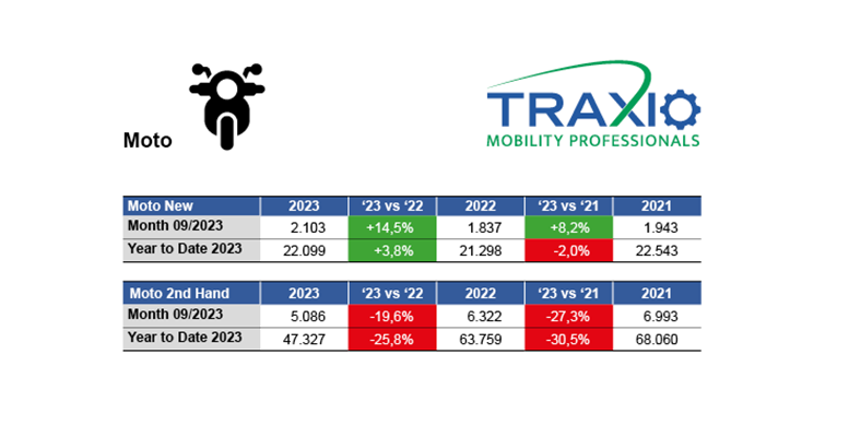 Filip Rylant, woordvoerder van mobiliteitsfederatie TRAXIO vat de situatie samen : “De malaise op de tweedehandsmarkt blijft ook in september voortduren. Er werden vorige maand (5.086 eenheden) immers -19,6% minder occasie moto’s ingeschreven dan vorig jaar in september. Gecumuleerd over de eerste negen maanden loopt het verlies op tot 16.432 motoren of meer dan een kwart: -25,8%. Er zijn gedurende de eerste negen maanden amper 47.327 occasie motorfietsen ingeschreven tegenover 63.957 in 2022 en zelfs 68.060 in 2021 – een verschil van maar liefst 30% of 20.733 eenheden op twee jaar tijd... De Belgische motorrijder die zijn motor van de hand doet, blijft nog steeds zijn toevlucht zoeken tot verkoop in het buitenland of aan buitenlandse opkopers om op die manier te ontsnappen aan de verplichte keuring voor occasiemotoren. Daardoor zal het Belgische motorenpark op termijn sterk afnemen en dat zal ernstige gevolgen zal hebben voor de motoreconomiedealers en de onderdelenleveranciers.
