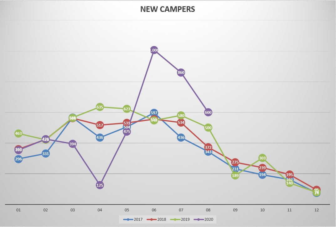 Na de lockdown steeg het aantal inschrijvingen van nieuwe kampeerwagens tot een absoluut record in juni: van 548 in 2019 naar 1.006 (+84 %) in 2020! Ook juli (580 in 2019 versus 860 in 2020 hetzij +48 %) en augustus* (500 in 2019 versus 600 in 2020 hetzij +20 %) waren topmaanden. Idem dito voor de tweedehandse inschrijvingen met topmaanden juni (+40 %), juli (+24%) en augustus (+29 %).