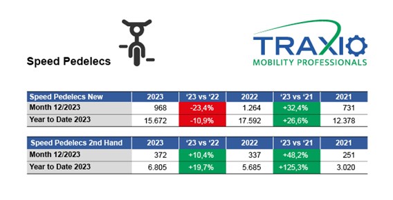 Op de tweedehandsmarkt was december alweer een sterke maand met een stijging van maar liefst +10,4% (372 stuks) waardoor er in 2023 precies 1.120 occasies meer (+19,7%) werden ingeschreven dan in 2022 en zelfs +125,3% meer dan twee jaar geleden. Over het volledige jaar lieten de tweedehandse speed pedelecs het recordcijfer van 6.805 exemplaren optekenen, het blijven verbluffende groeicijfers in een markt die nog mooie toekomstperspectieven biedt.”