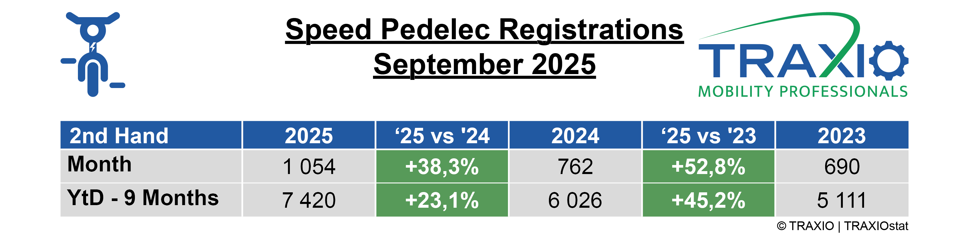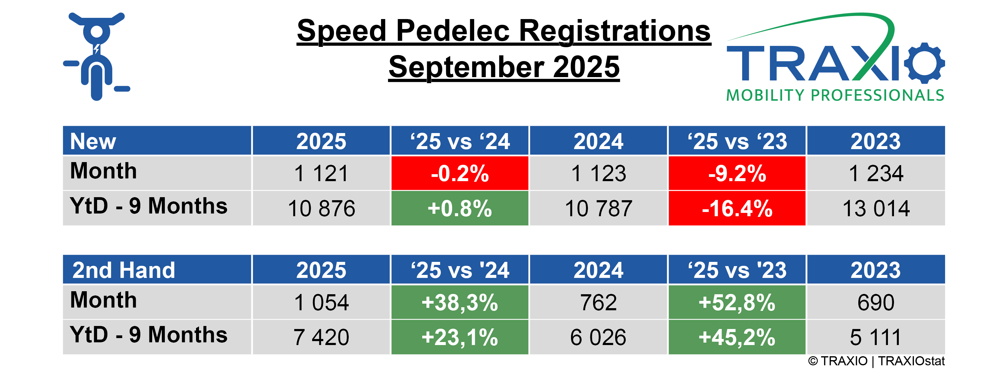 Speed pedelecs, negen maanden: voor het eerst meer dan 1.000 tweedehandse inschrijvingen op maandbasis, nieuwmarkt blijft positief