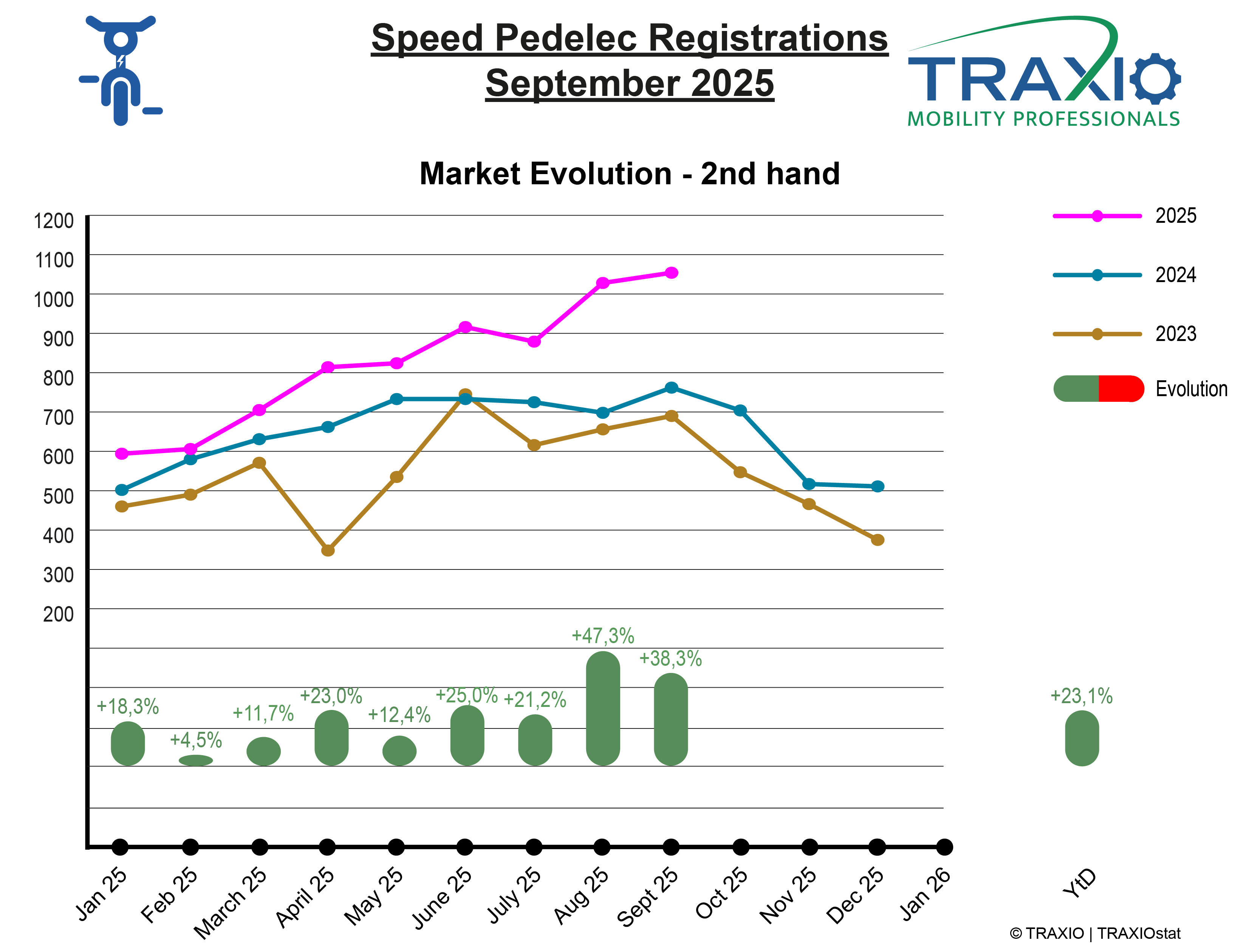 De markt voor tweedehandse speed pedelecs blijft ongekend sterk groeien. In de eerste negen maanden van dit jaar werden er al 7.420 opnieuw ingeschreven (+23,1%) tegenover 6.026 in dezelfde periode vorig jaar. Ten opzichte van 2023 bedraagt de stijging zelfs +45,2%.