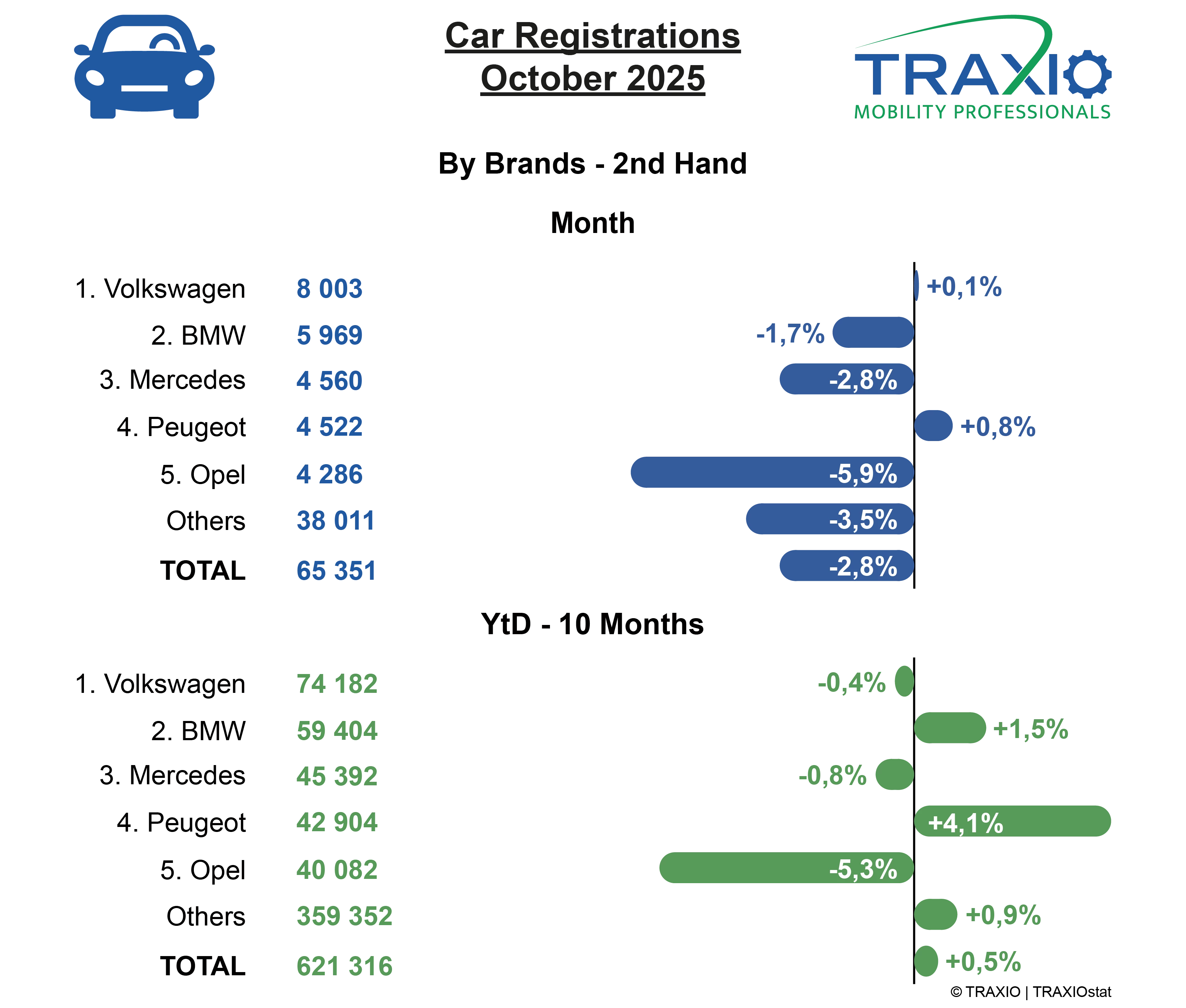 Tijdens de eerste 10 maanden van 2025 domineerden Volkswagen en BMW de lijst van meest ingeschreven tweedehandsmerken. De top 5 wordt aangevuld door Mercedes, voor Peugeot en Opel.
