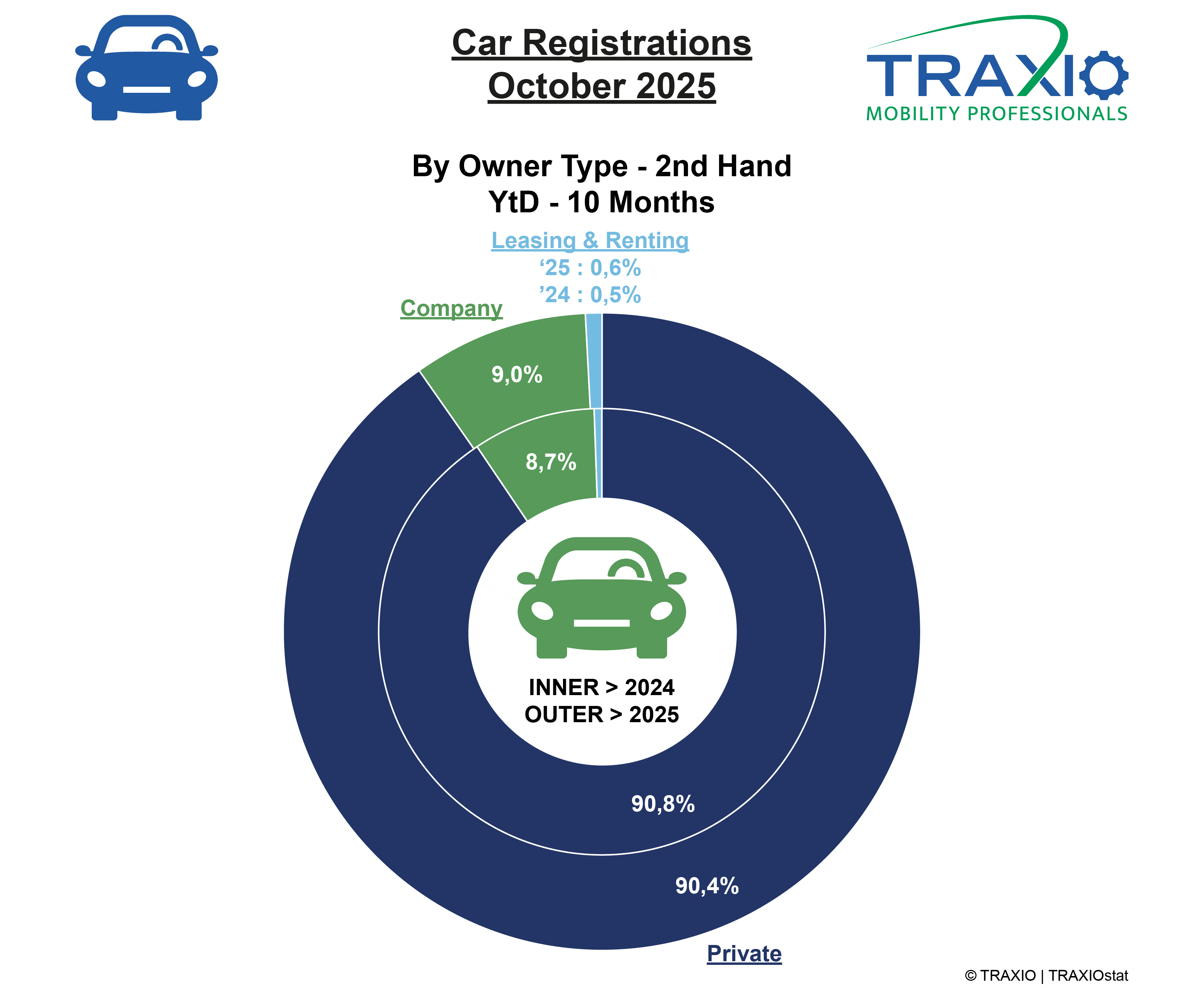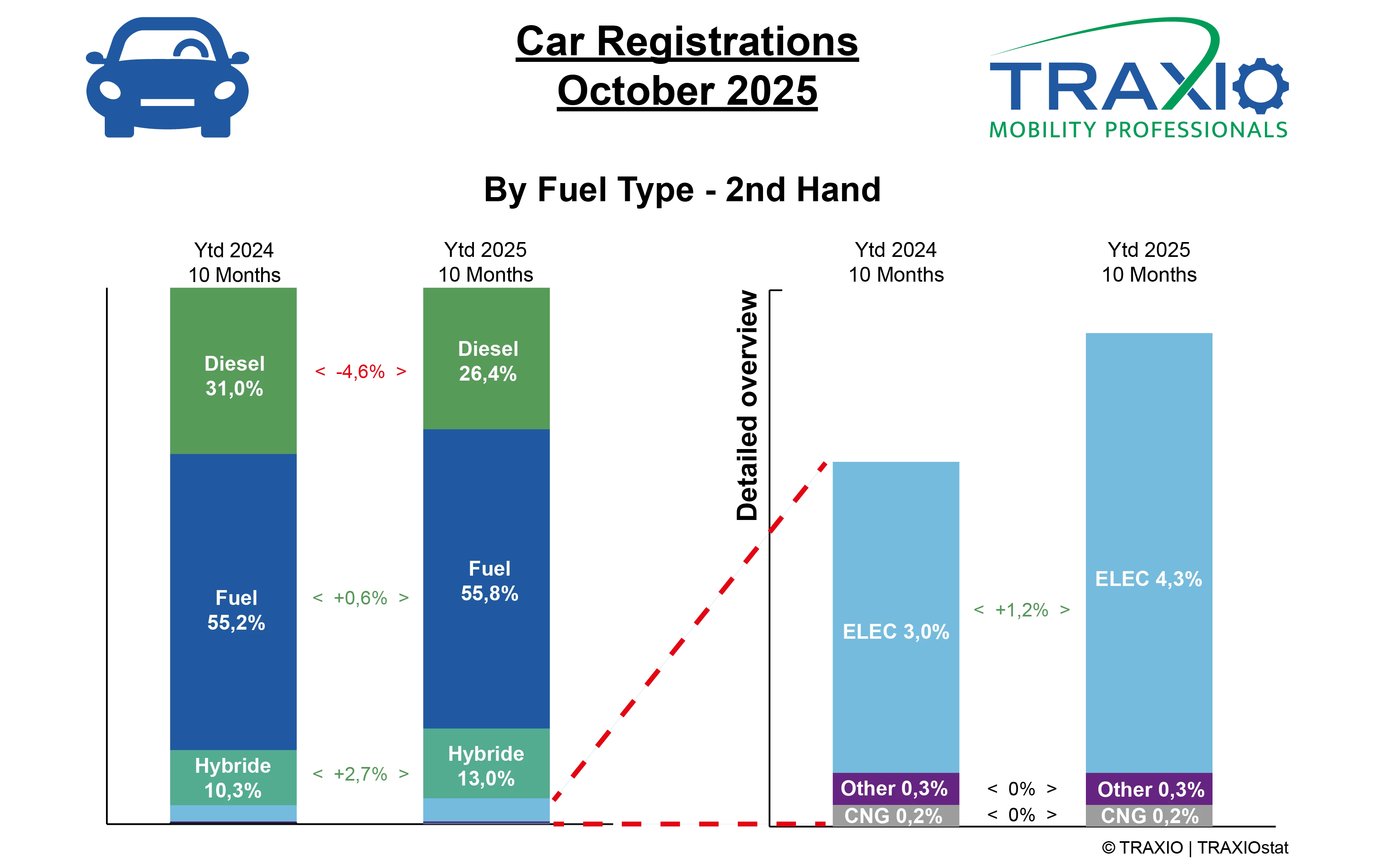 De cijfers van oktober 2025 tonen een daling in het aantal inschrijvingen van tweedehandswagens in vergelijking met vorig jaar. Afgelopen maand werden in België 65.351 tweedehandswagens opnieuw ingeschreven, dat zijn er -1.850 minder (-2,8%) dan in oktober 2024 (67.201) maar wel 4.203 meer dan in oktober 2023 (+6,9%). Over de eerste 10 maanden doet 2025 het net iets beter dan het zeer sterke jaar 2024 (+0,5%) en dat onderstreept de veerkracht van de markt, die gedragen wordt door een aanhoudende vraag van particulieren. Zij zijn goed voor 90,4% van de herinschrijvingen.