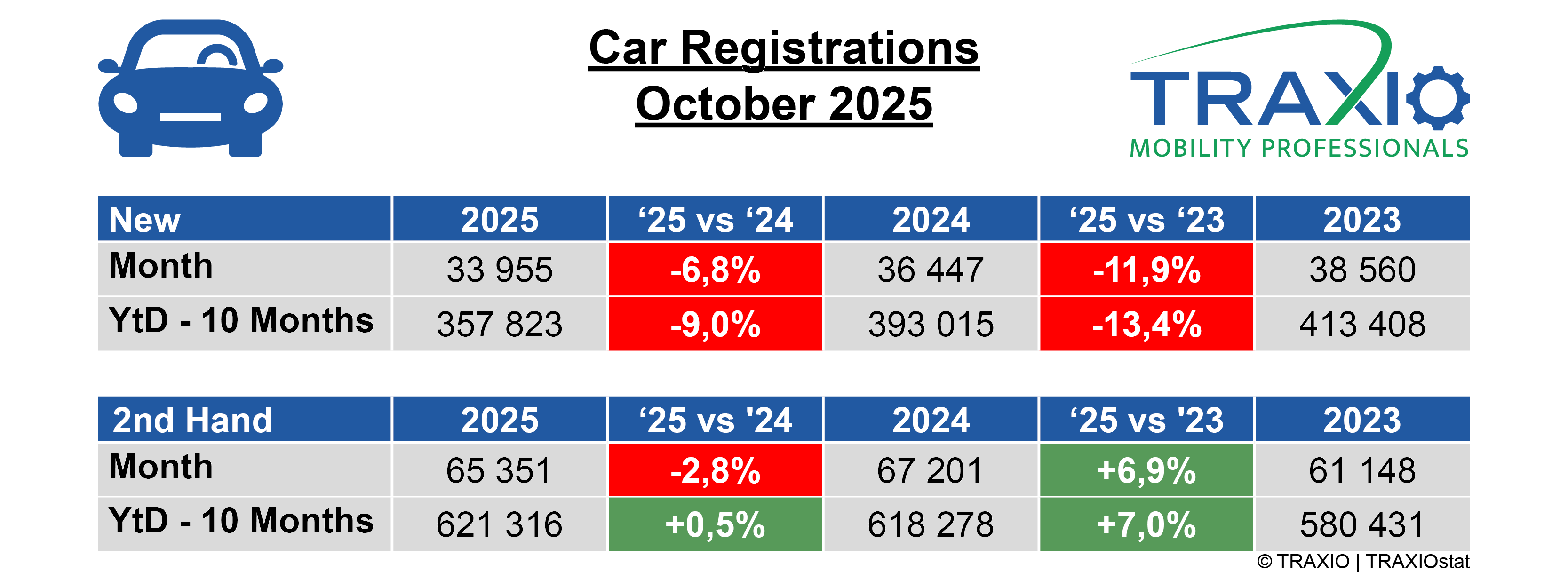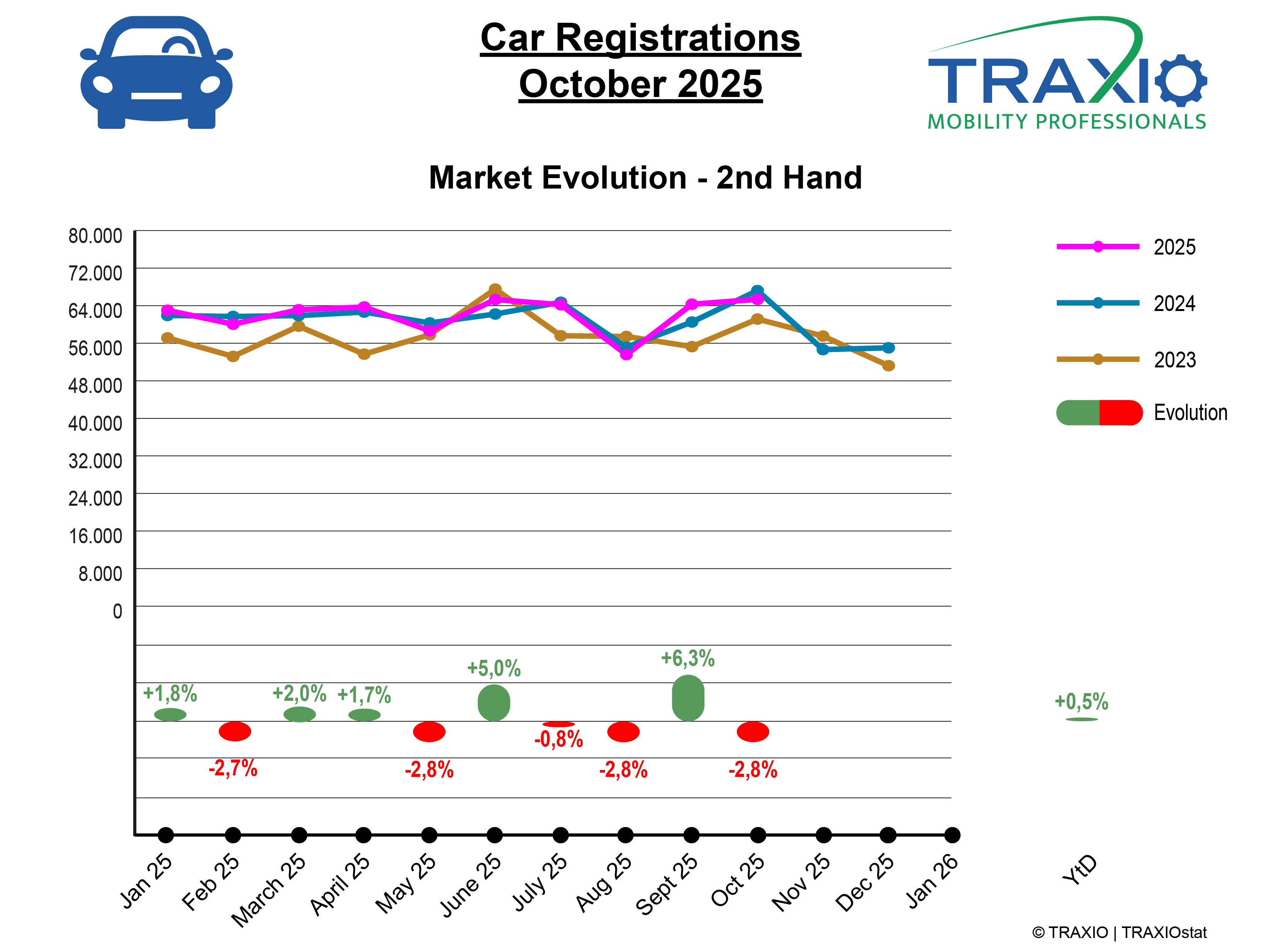 Filip Rylant, woordvoerder van mobiliteitsfederatie TRAXIO: “Het was tijdens de maand oktober rustiger op de tweedehandsmarkt dan vorig jaar, met een daling van -2,8% tot 65.351 eenheden, en dat hebben we effectief gemerkt we in de showrooms. Toch blijft de markt op een hoog niveau presteren want na 10 maanden staat de teller op 621.316 ingeschreven occasiewagens en dat is +0,5% meer dan het zeer succesvolle jaar 2024. Het blijft afwachten wat de consument gaat doen in de komende 2 maanden want het is duidelijk dat het vertrouwen niet meer top is. Ook een mogelijke pre-Autosalon promoperiode van sommige merken zou impact kunnen hebben op de tweedehandsmarkt. Anderzijds verwachten we wel extra beweging door de verstrenging van de Brusselse Lage Emissie Zone, maar die versnelling is nog niet ingezet. Helaas zal daarbij een aantal autogebruikers hun te oude wagen niet kunnen vervangen door een recenter exemplaar.