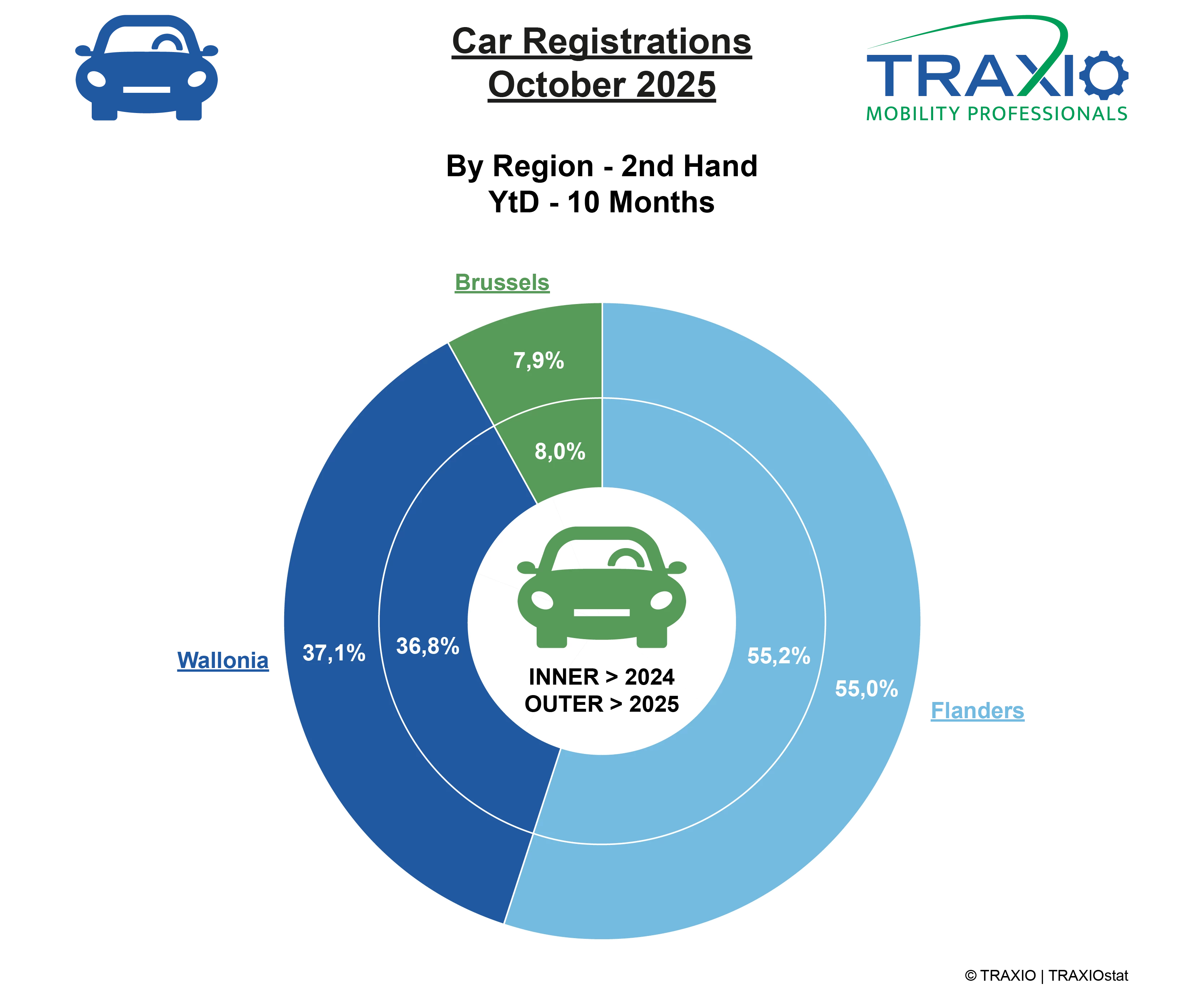 Vlaanderen blijft de markt voor inschrijvingen van tweedehandse personenwagens domineren, met een aandeel van 55,0%. Het marktaandeel van Wallonië bedraagt 37,1% terwijl Brussel 7,9% haalt.