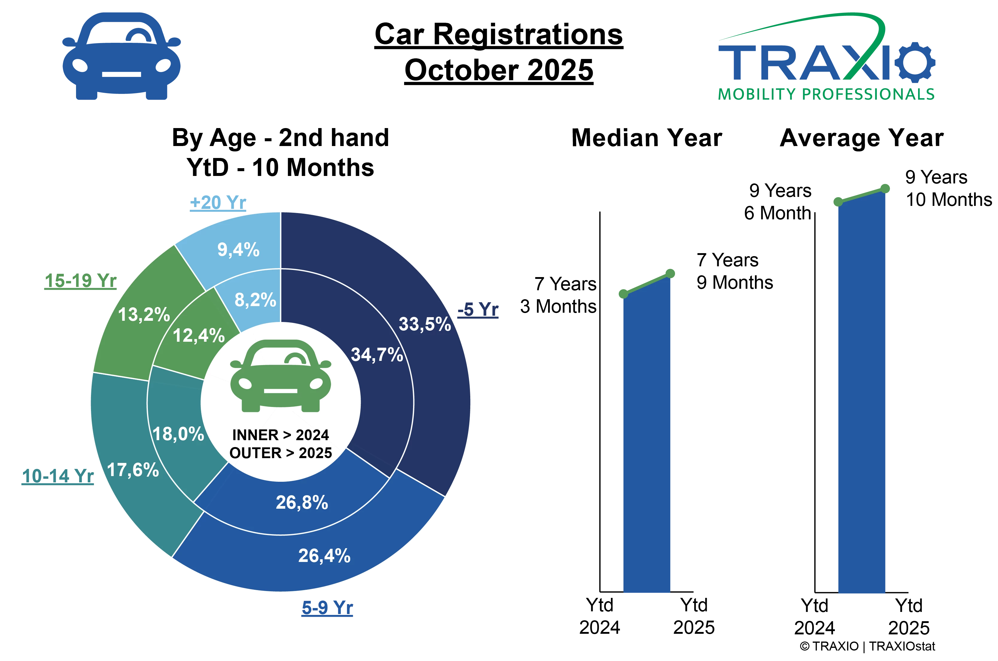 In de eerste 10 maanden van 2025 is de gemiddelde leeftijd van de occasie-inschrijvingen verder gestegen tot 9 jaar en 10 maanden. De mediane leeftijd van zijn kant is nu 7 jaar en 9 maanden, wat wijst op een verdere vergrijzing van het wagenpark. De mediane leeftijd van de occasie-inschrijvingen verraadt op zich niet echt dat het totale wagenpark flink aan het verouderen is, en dat is uiteraard een nefast verschijnsel voor de vergroening en uitstootreductie.