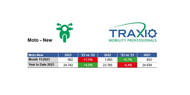 Cette année, nous avons pu observer une certaine instabilité dans les ventes de motos neuves, avec des fluctuations régulières. Le mois de novembre s’est révélé nettement moins bon, avec à peine 902 motos neuves immatriculées, soit une baisse de -17,5 % par rapport au mois de novembre de l'année dernière. Néanmoins, le total annuel préliminaire reste positif avec une augmentation de +4 % pour atteindre 24 742 unités, ce qui est plus que le nombre total de motos neuves immatriculées pendant toute l'année 2022. Les livraisons de motos sont plus fluides mais le nombre d'acheteurs enthousiastes a connu une baisse au cours des trois premières semaines du mois en raison en raison des conditions météorologiques défavorables persistantes. Fort heureusement, vers la fin novembre, il y a eu un retour de plus de visiteurs dans les showrooms. On constate que beaucoup de clients attendent les campagnes commerciales de janvier et que certaines marques n'introduiront vraiment des nouveautés importantes qu'en 2024.