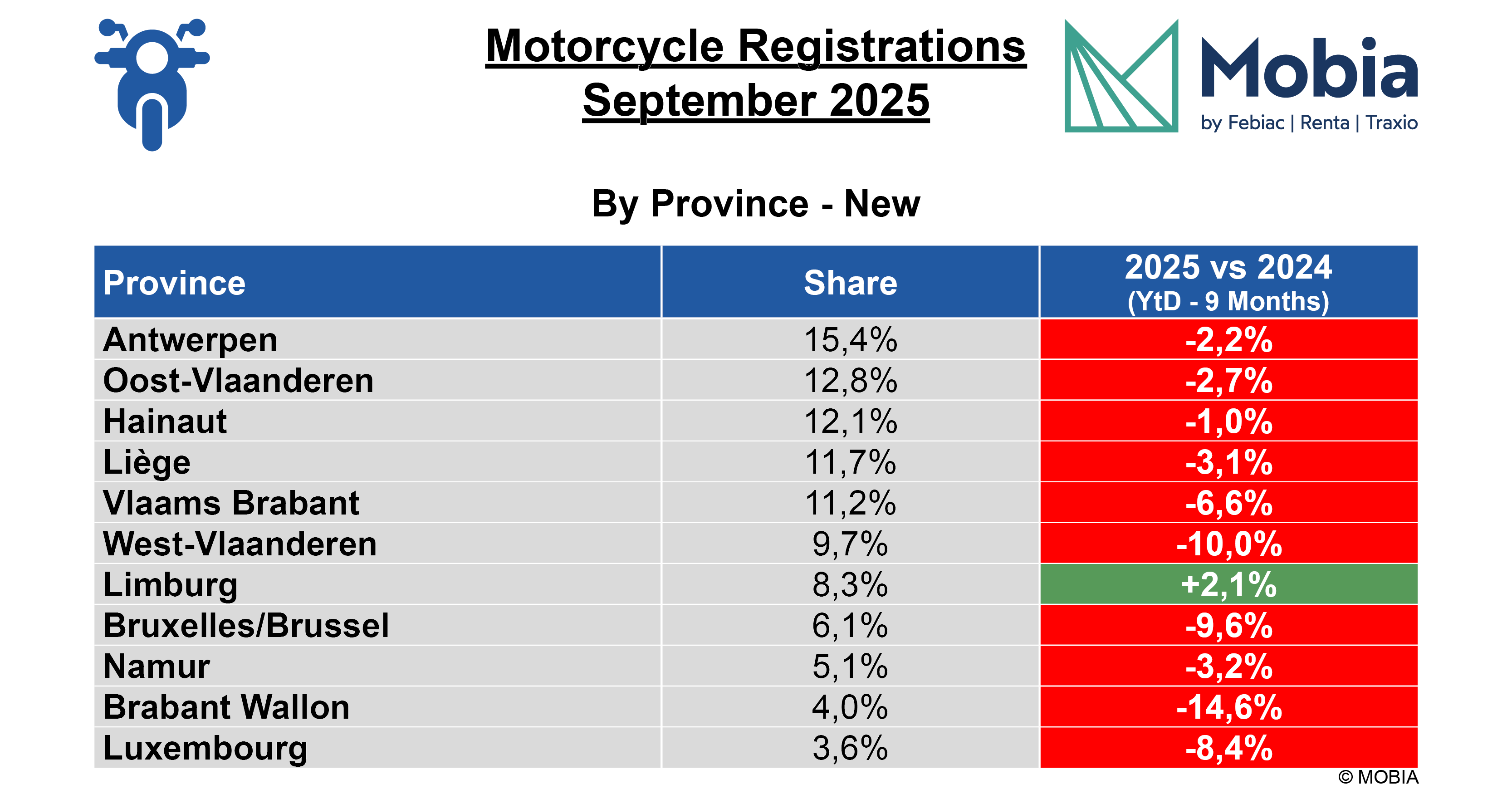 Les statistiques cumulées des immatriculations neuves par région révèlent quelques aspects intéressants. La Flandre demeure la région la plus importante avec 57,4% des ventes totales de motos neuves dans notre pays. La Wallonie prend 36,5% à son compte et Bruxelles 6,1%.