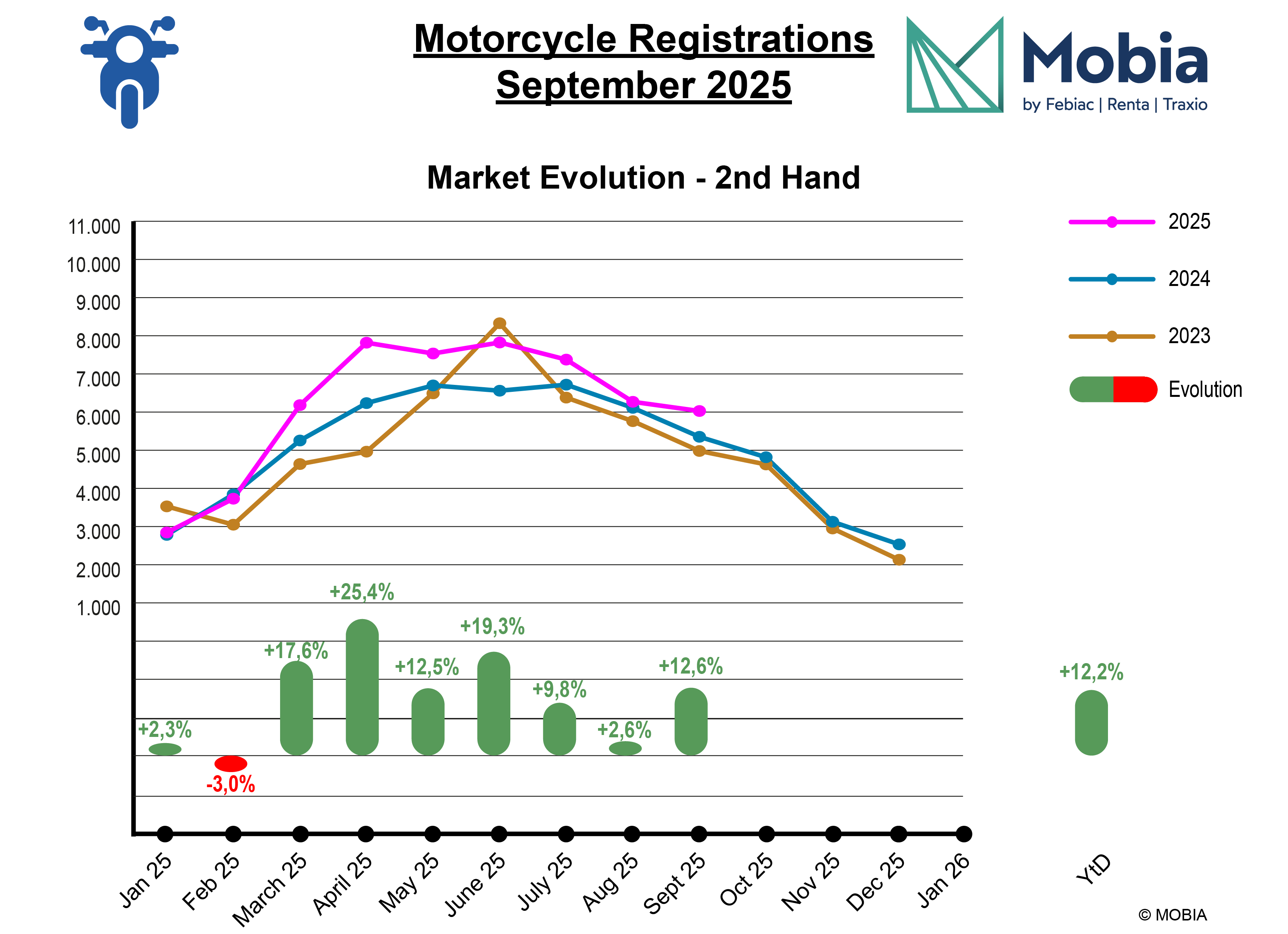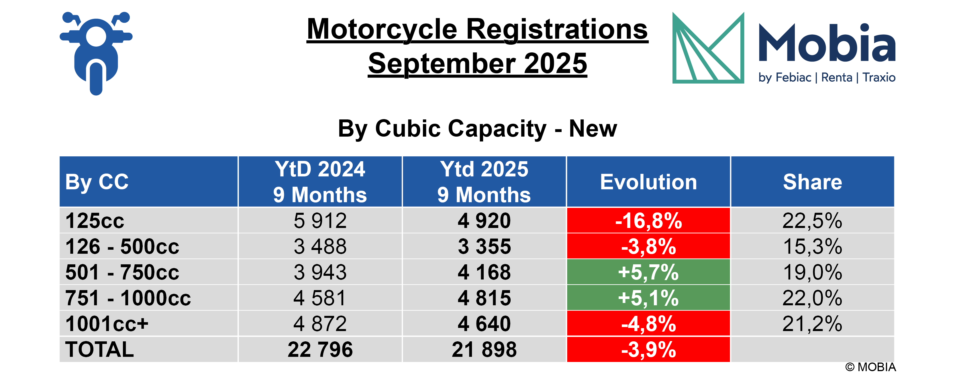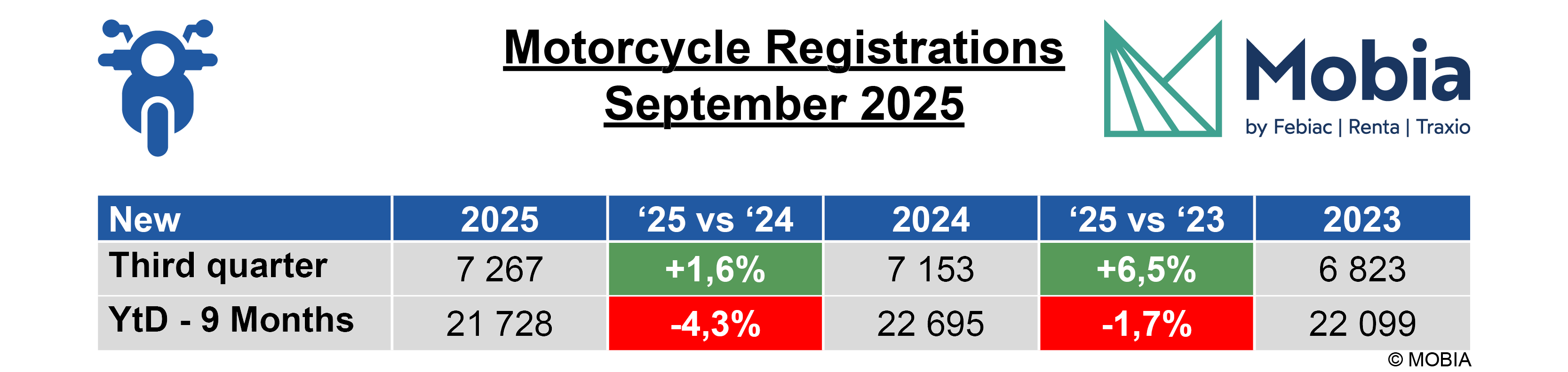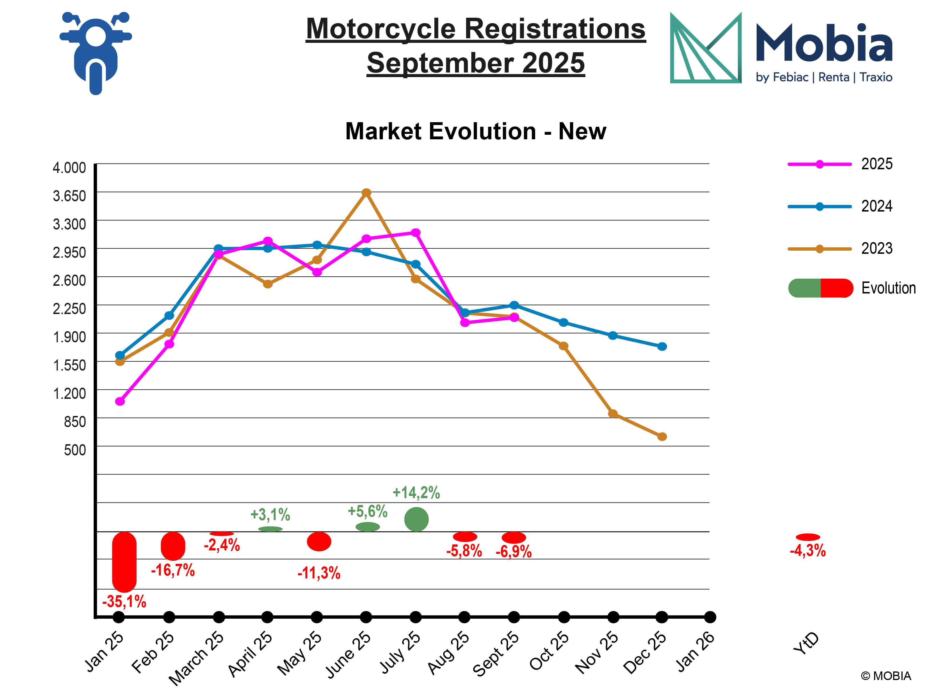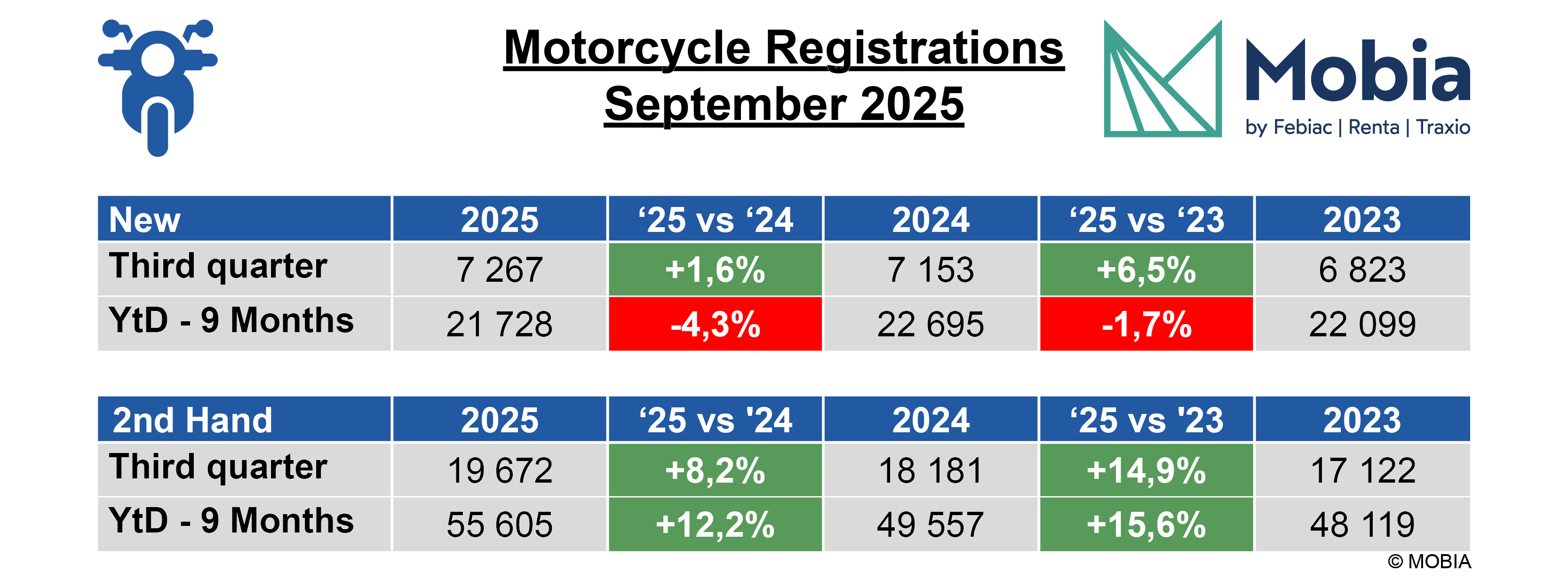 Christophe Dubon, porte-parole de FEBIAC : « Au cours des neuf premiers mois de 2025, le marché des motos neuves a accusé un léger recul de -4,3 % et totalise 21.728 immatriculations. Ce résultat est plus qu’honorable comparé au grand cru de 2024 et sa belle surprise de dernière minute, à savoir les immatriculations Euro-5 à la fin de l’année. En conséquence, le marché de la moto a connu des débuts laborieux en 2025 mais les statistiques ont repris des couleurs juste avant et au début de l’été. Le mois de juillet surtout s’est révélé excellent avec une hausse de +14,2 %. En revanche, les immatriculations ont décliné en août et septembre : -5,7 % en août et -6,9 % en septembre. Les trois premiers trimestres se clôturent sur une baisse de -4,3 % comparée à la même période en 2024 mais le résultat n’est certainement pas mauvais, d’autant que certaines marques ont éprouvé des difficultés de livraison de leurs nouveaux modèles. »