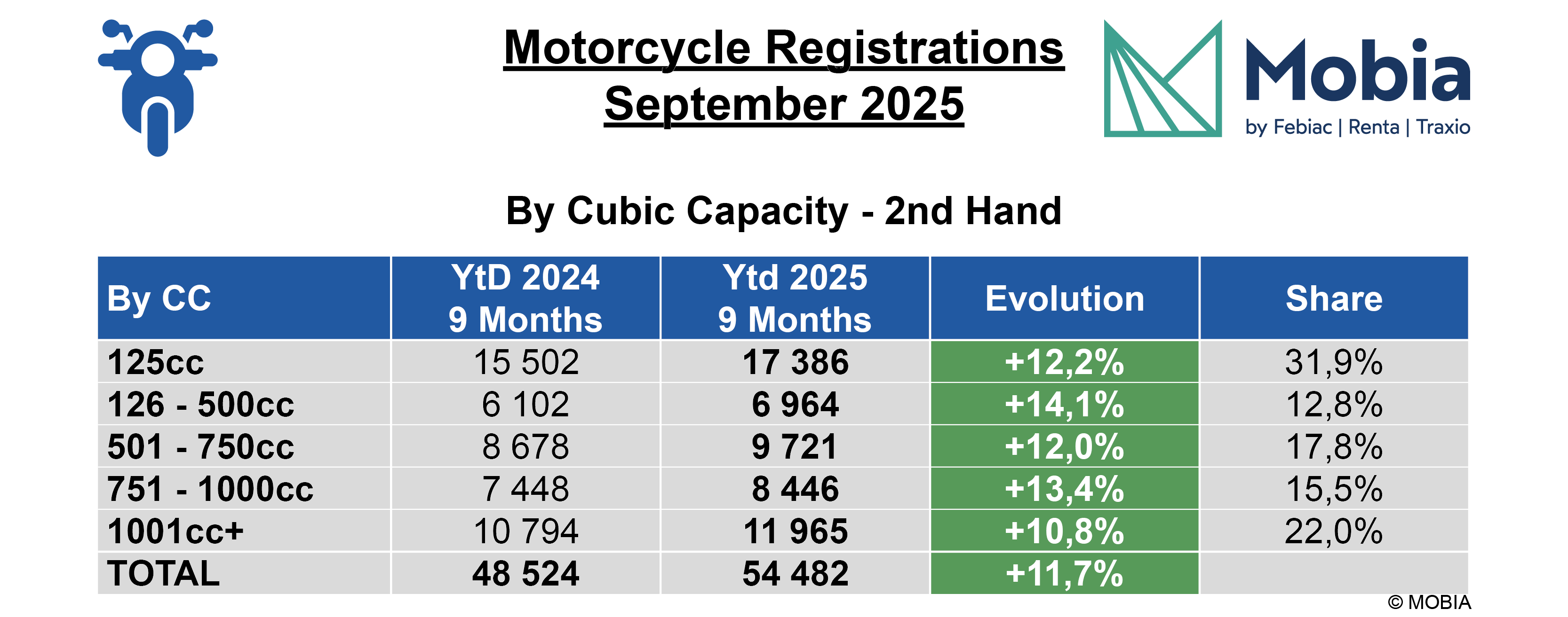 Immatriculations des motos d’occasion – par cylindrée (septembre 2025)
