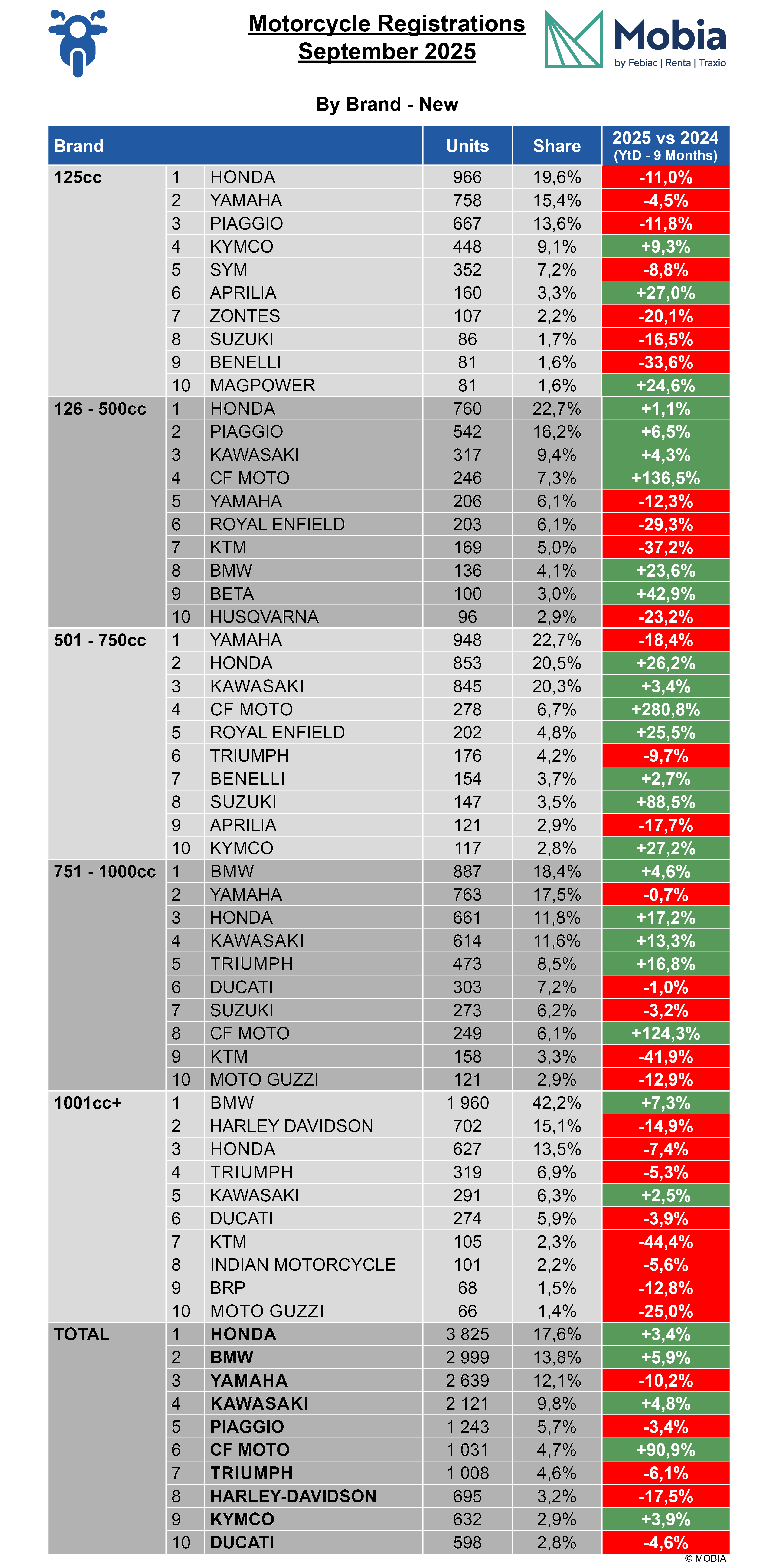 Immatriculations des motos neuves – par cylindrée (septembre 2025)