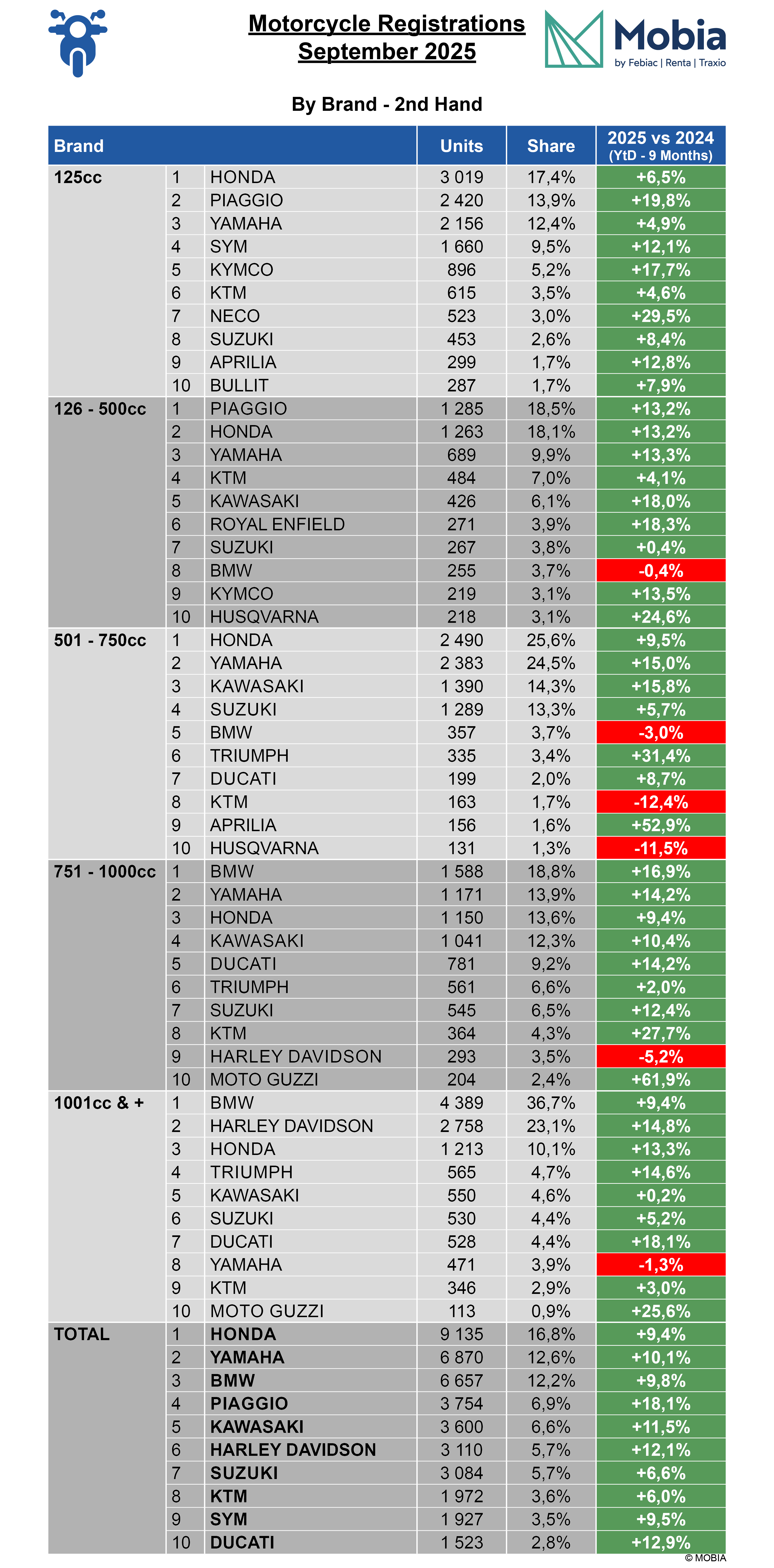 Immatriculations des motos d’occasion – par marque (septembre 2025)