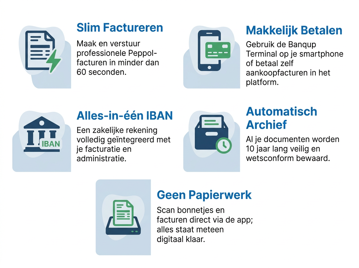 - E-facturatie & E-reporting (2026-2028): De wetgeving verandert. Sinds 1 januari 2026 is e-facturatie via Peppol de norm in België. Met Banqup ben je vandaag al 100% compliant en technisch volledig voorbereid op de komende digitale rapportage (e-reporting) van 2028. Jij bent de wetgeving een stap voor zonder administratieve rompslomp.